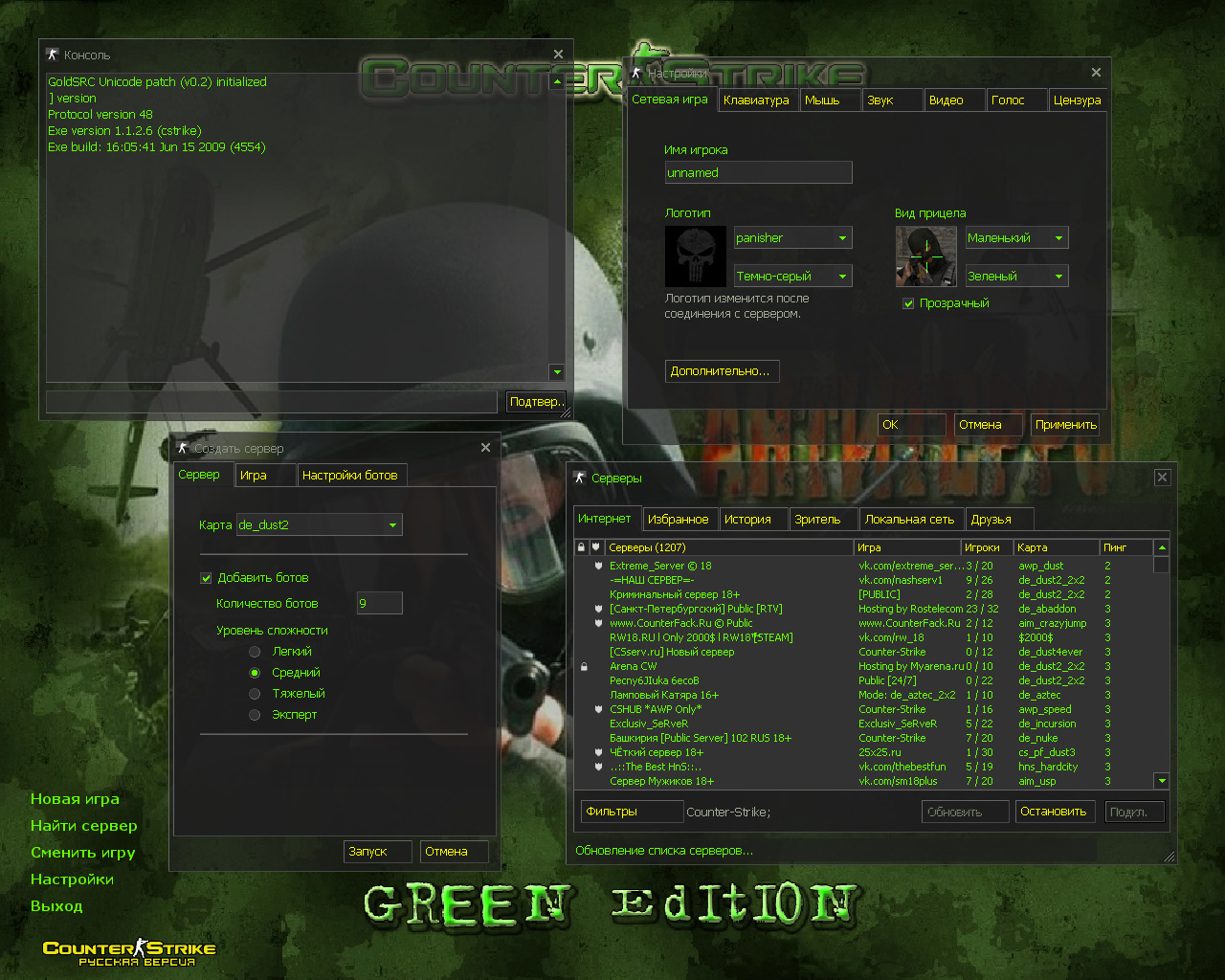 Полная русская версия (текст и озвучка) Подстройка под протокол сервера (47/48) Исправлен мастер-сервер поиск серверов Заменены модели оружия, игроков, заложников и прочее Радиокоманды, чат ботов и другие звуки заменены Изменено меню игры (больше зеленого цвета) Меню в игре (клавиша H) дополнено Для каждой снайперской винтовки свой прицел Заменены спецэффекты (дым, кровь, взрывы и т.д.) Без рекламы и вирусов Добавлен русский чат Добавлены zBot'ы 1.5 для CS Добавлены Parabot'ы 0.91 для HL Добавлены карты и логотипы